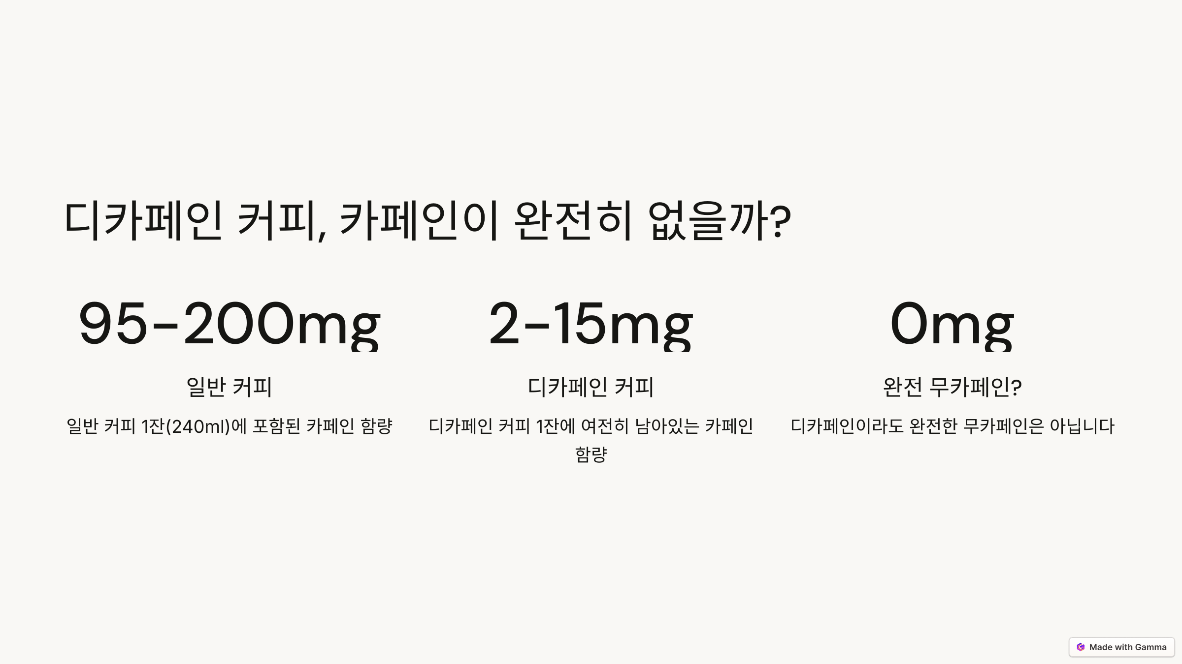 - 카페인에 매우 민감한 사람은 **디카페인 커피의 미량 카페인에도 반응할 수 있음**