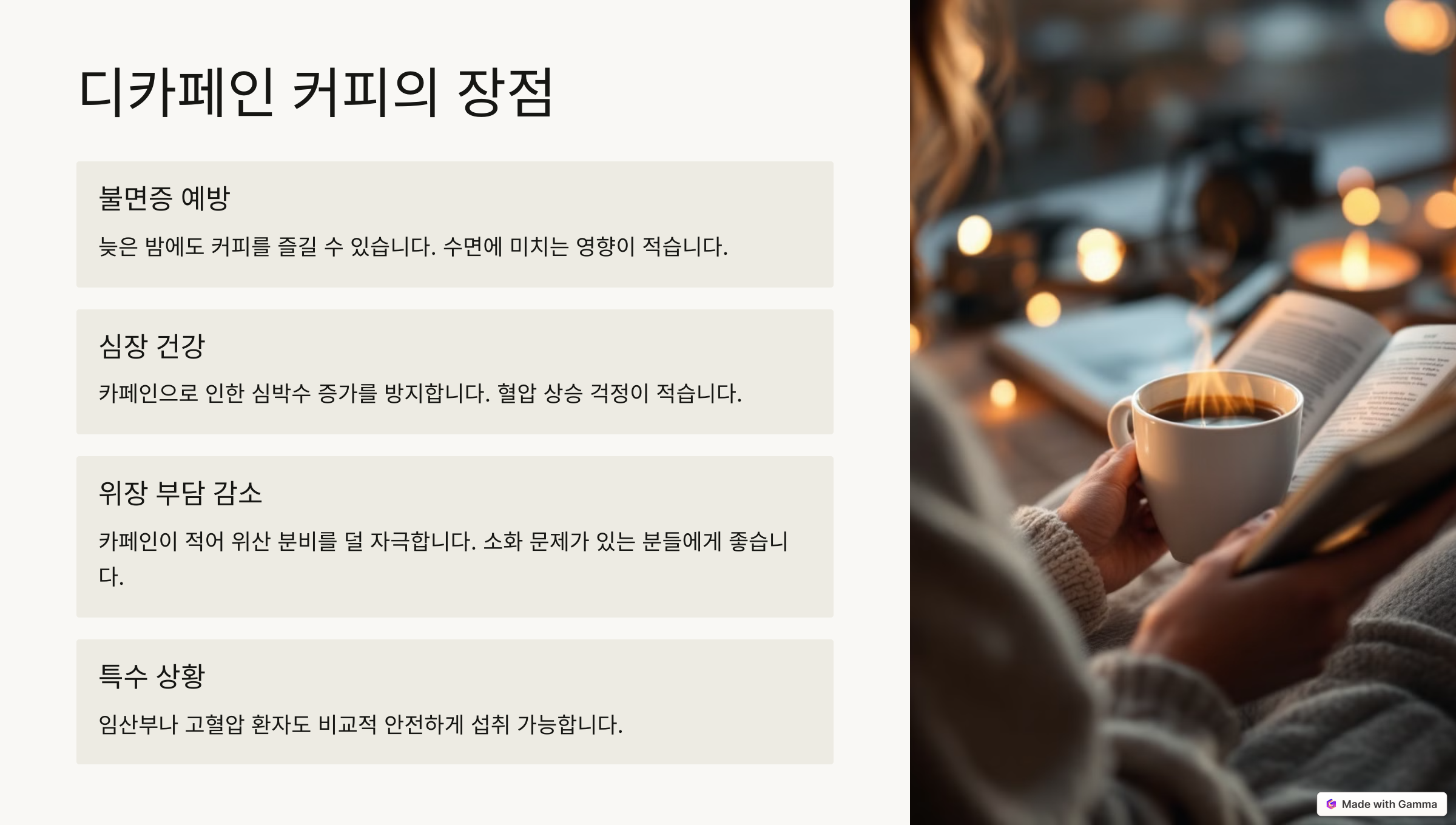 ☑ **불면증 예방** → 늦은 밤에도 커피를 즐길 수 있음