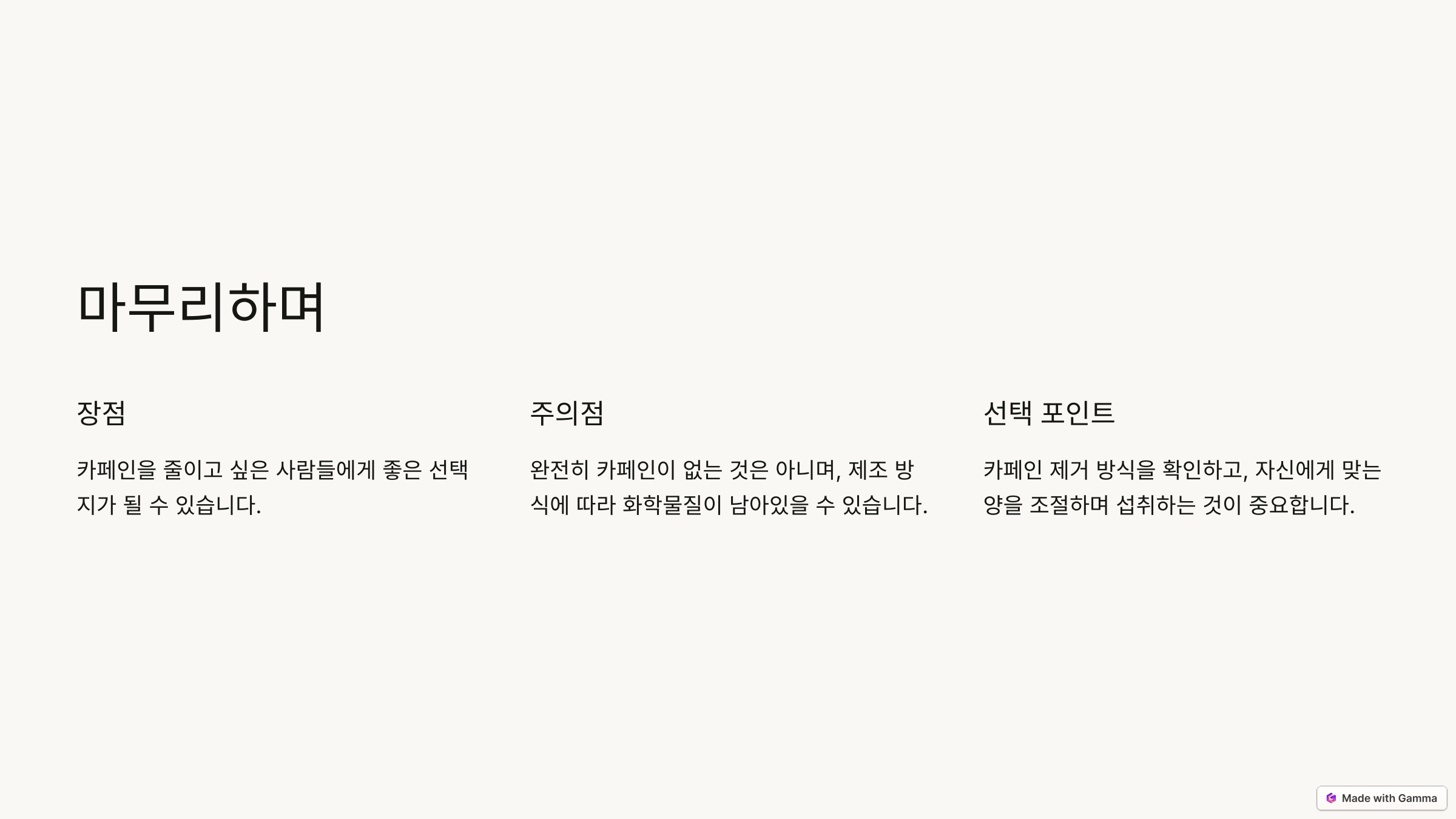 **완전히 카페인이 없는 것은 아니며, 제조 방식에 따라 화학물질이 남아 있을 가능성도 있다는 점을 기억하세요!**