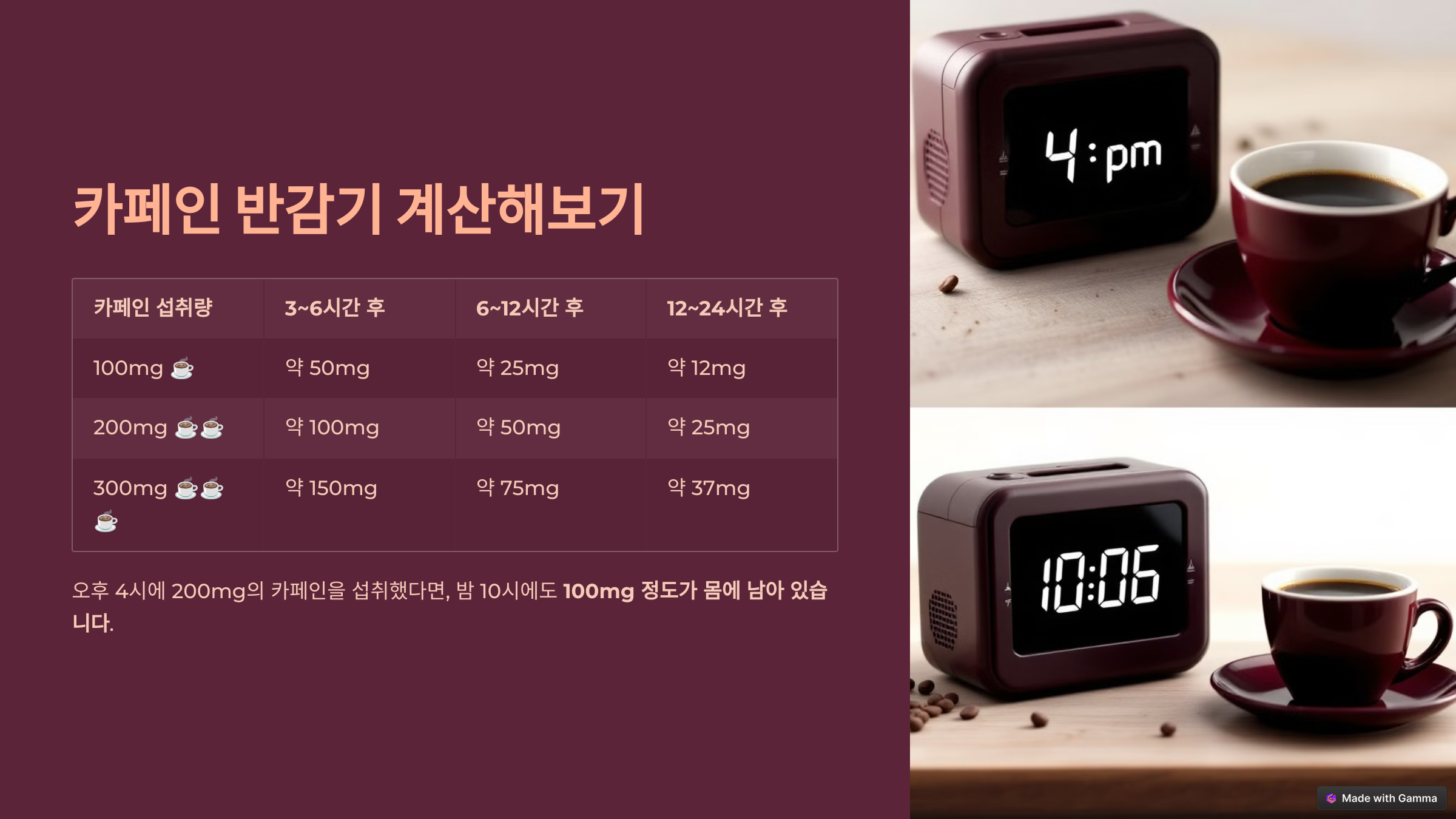 💡 카페인의 반감기가 3~6시간이라는 걸 기억하고, 다음 표를 참고해 보세요!