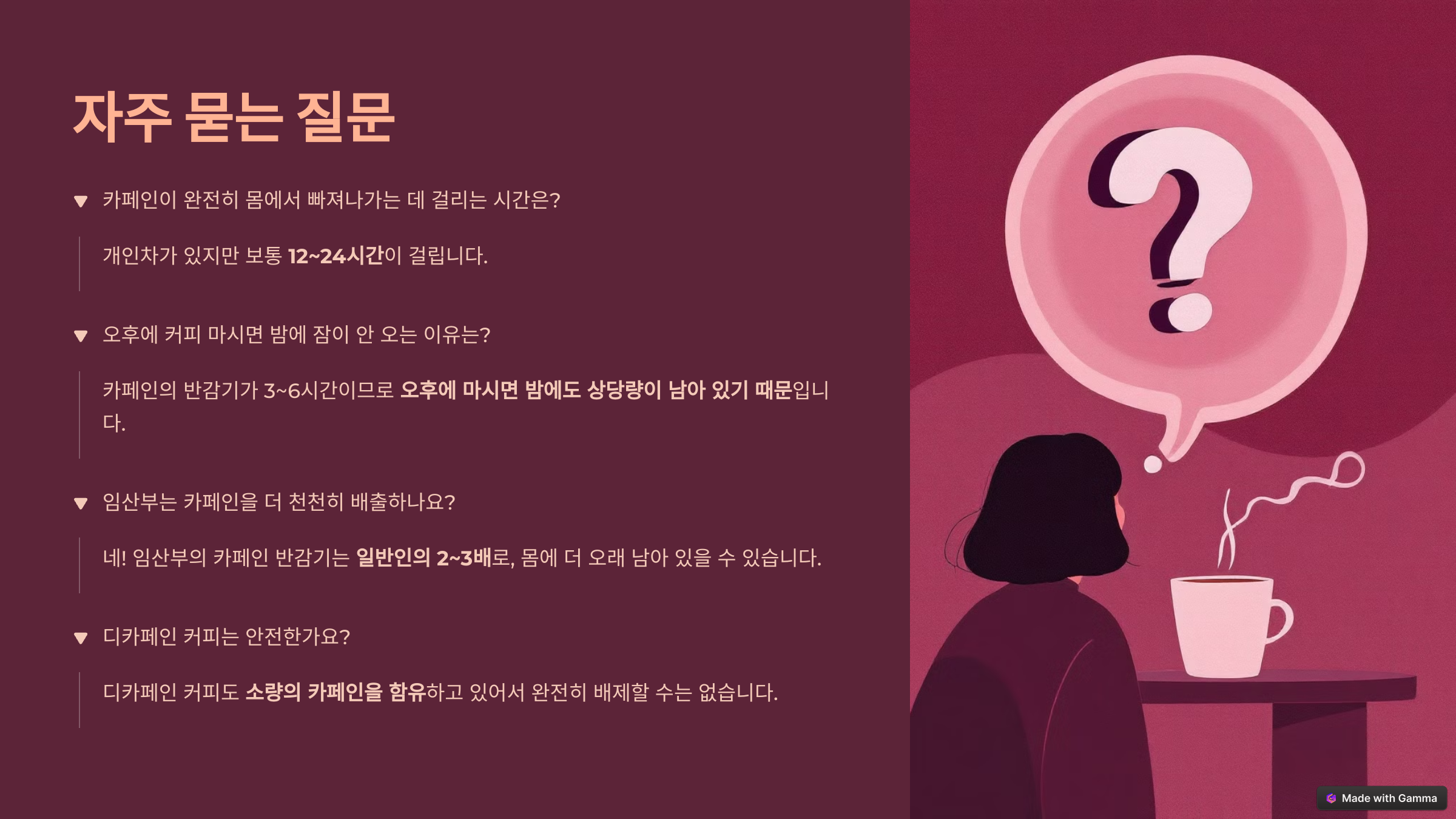 ### 2. **오후에 커피 마시면 밤에 잠이 안 오는 이유는?**