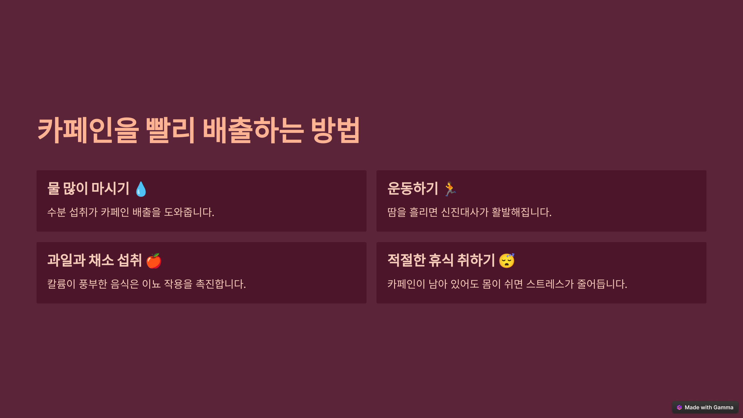 ✅ **물 많이 마시기** 💧 → 수분 섭취가 카페인 배출을 도와요!